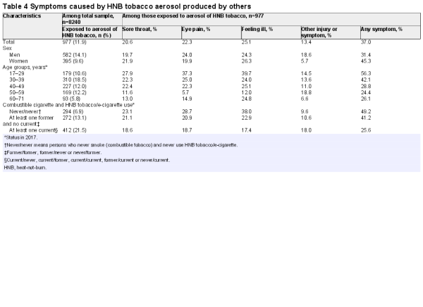 In all, 12% of respondents (n=997) had been exposed to secondhand HNB tobacco aerosol (table 4). Of them, 37% had experienced at least one symptom as a result, with the most common complaint being generally feeling ill, followed by eye discomfort and then a sore throat. Only 26% of current users reported having experienced at least one symptom, in comparison with 41% of former users and 49% of never-users of any tobacco product.