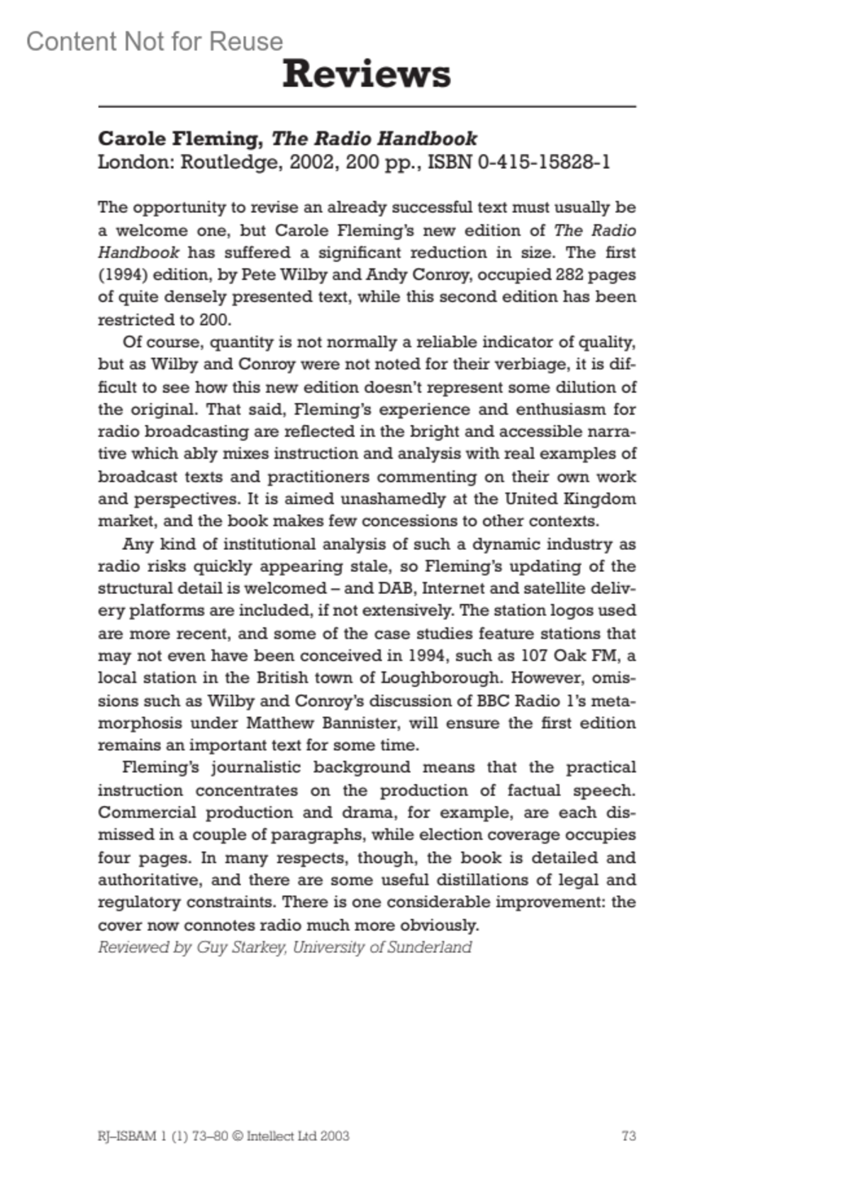 The Radio Journal: International Studies in Broadcast and Audio Media 1(1):p 78-80, March 2003.