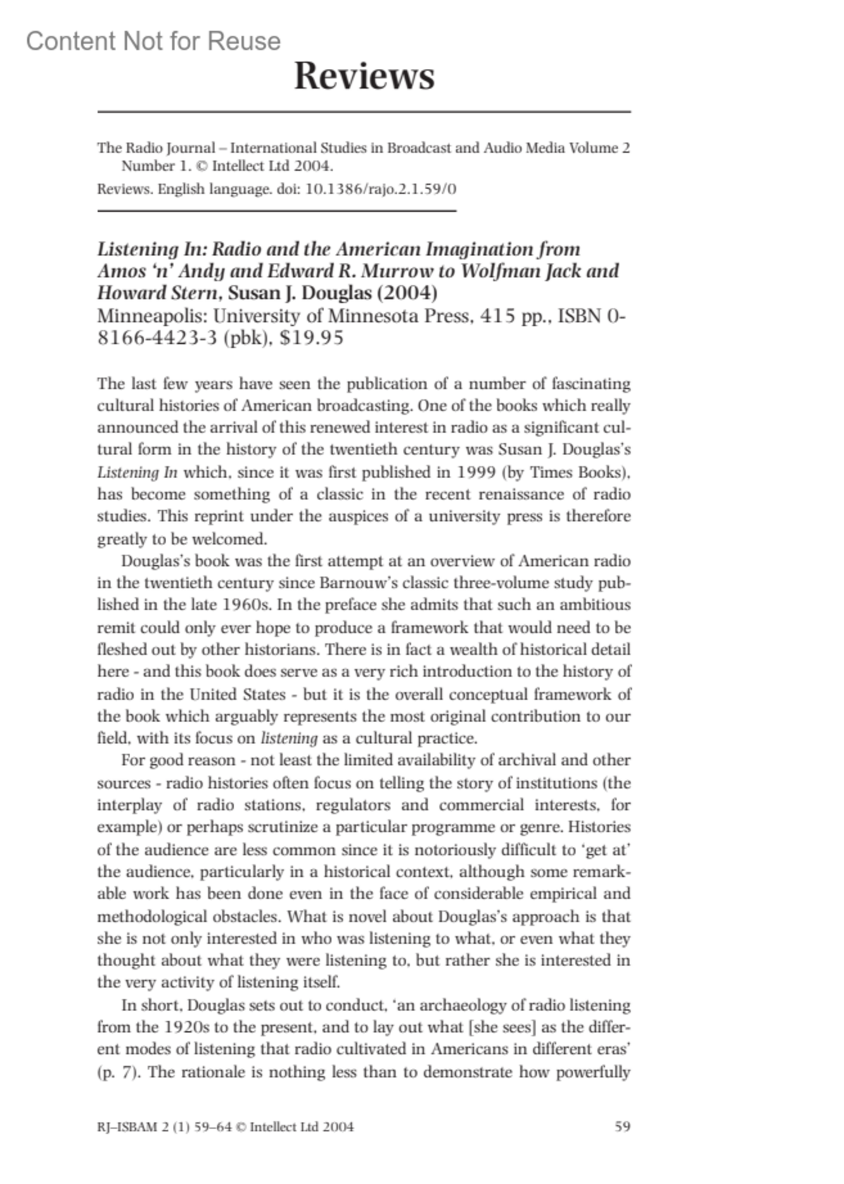 The Radio Journal: International Studies in Broadcast and Audio Media 2(1):p 59-61, June 2004.