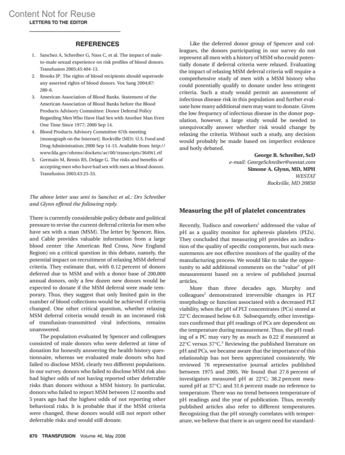 Marginal recruitment impact of potential alterations to FDA deferral criteria for men who have sex with menSchreiber, George B. ScDGlynn, Simone A. MD, MPHAuthor informatione-mail: [email protected] (Schreiber)WESTAT, Rockville, MD 20850 (Glynn)Transfusion 46(5):p 870, May 2006.Copyright © 2006 Blackwell Publishing Ltd.