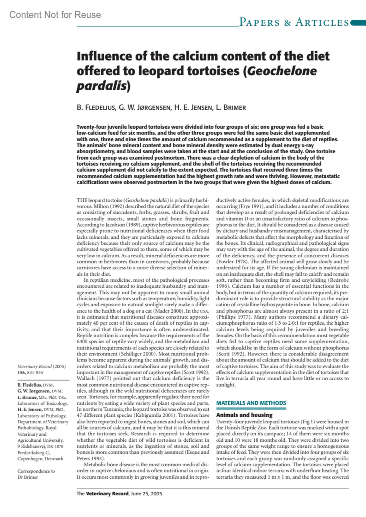 Influence of the calcium content of the diet offered to leopard tortoises (Geochelone pardalis)