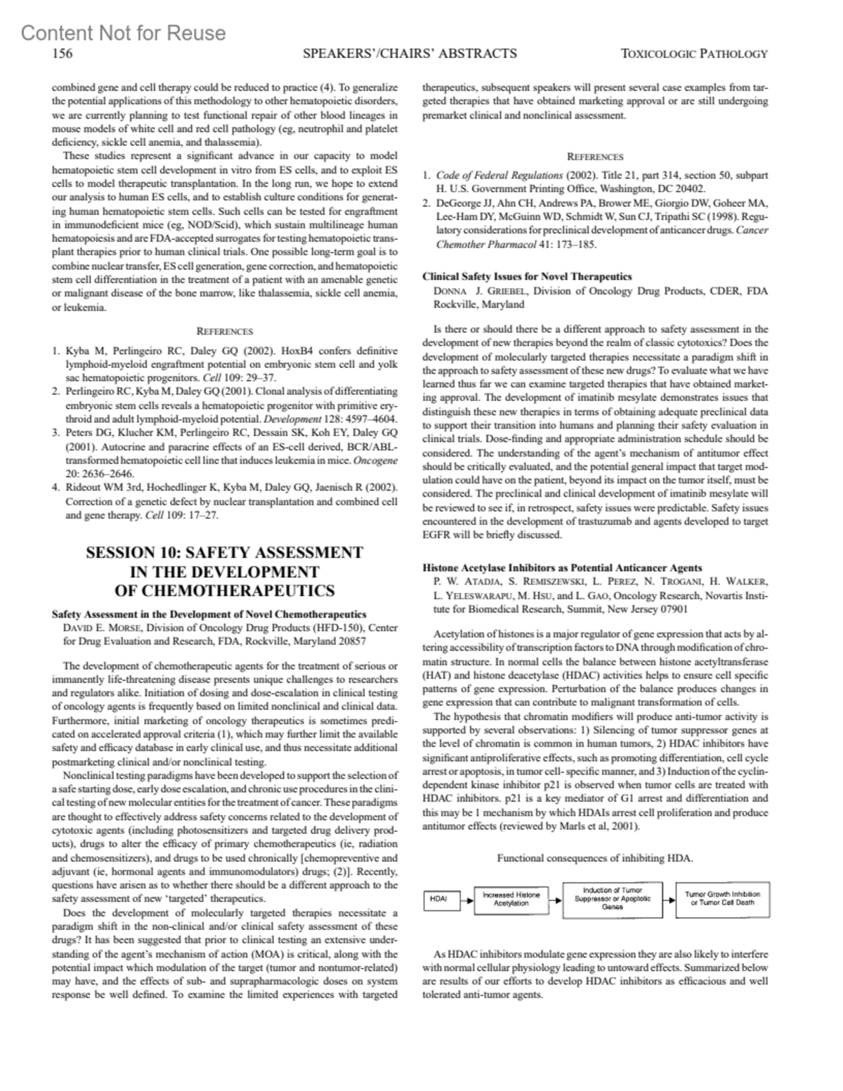 Safety Assessment in the Development of Novel ChemotherapeuticsMorse, David E.Author informationDivision of Oncology Drug Products (HFD-150), Center for Drug Evaluation and Research, FDA, Rockville, Maryland 20857Toxicologic Pathology 31(3):p 156, January 2003.Copyright ©2003Sage Publications