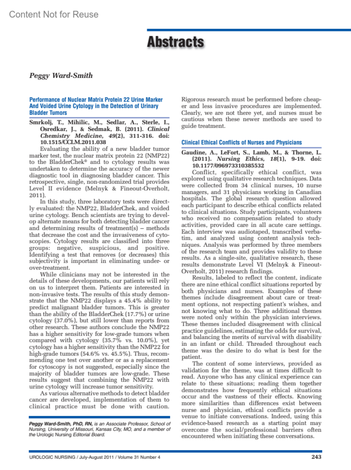 Stem Cell TherapyA Future Treatment of Stress Urinary IncontinenceWard-Smith, PeggyAuthor informationPeggy Ward-Smith, PhD, RN, is an Associate Professor, School of Nursing, University of Missouri, Kansas City, MO, and a member of the Urologic Nursing Editorial Board.Urologic Nursing 31(4):p 244-245, July-August 2011.COPYRIGHT © 2011 by the Society of Urologic Nurses and Associates, Inc. All rights reserved.