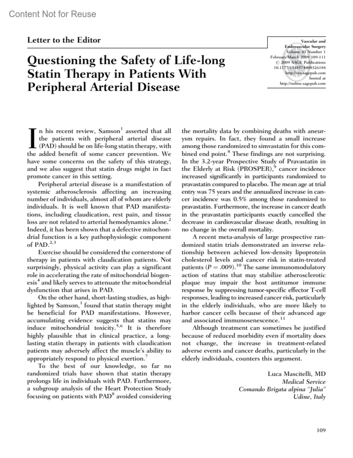 Questioning the Safety of Life-long Statin Therapy in Patients With Peripheral Arterial DiseaseSamson, Russell H. MD, FACS, RVTAuthor informationFlorida State University Medical School and Mote Vascular Foundation, Inc FloridaVascular and Endovascular Surgery 43(1):p 110-111, February-March 2009.Copyright ©2009Sage Publications