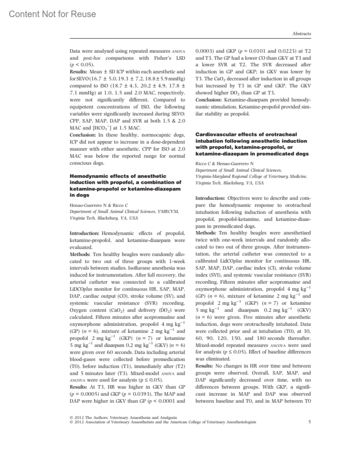 Veterinary Anaesthesia and Analgesia 39(4):p 5-6, July 2012.