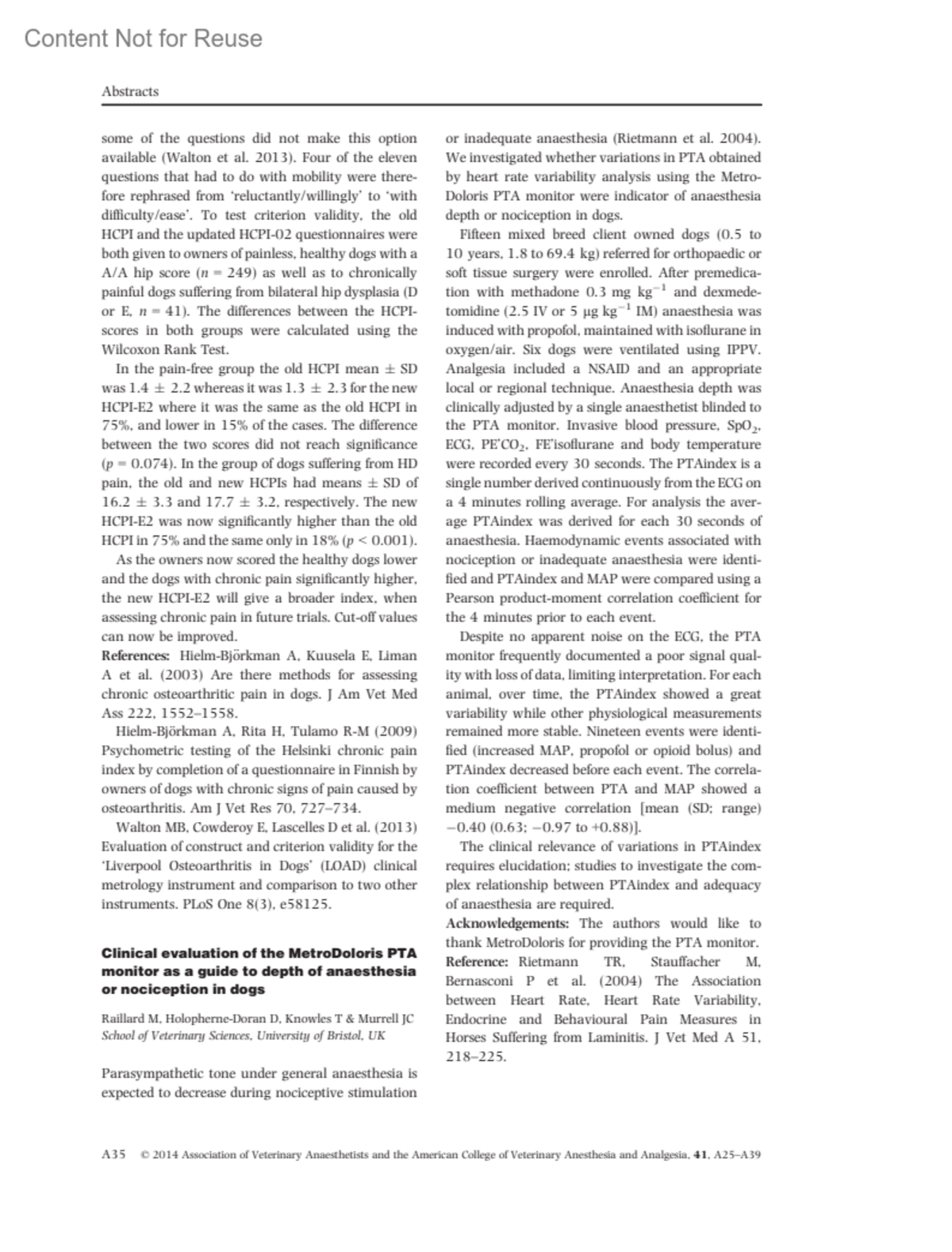 Veterinary Anaesthesia and Analgesia 41(2):p A35, March 2014.