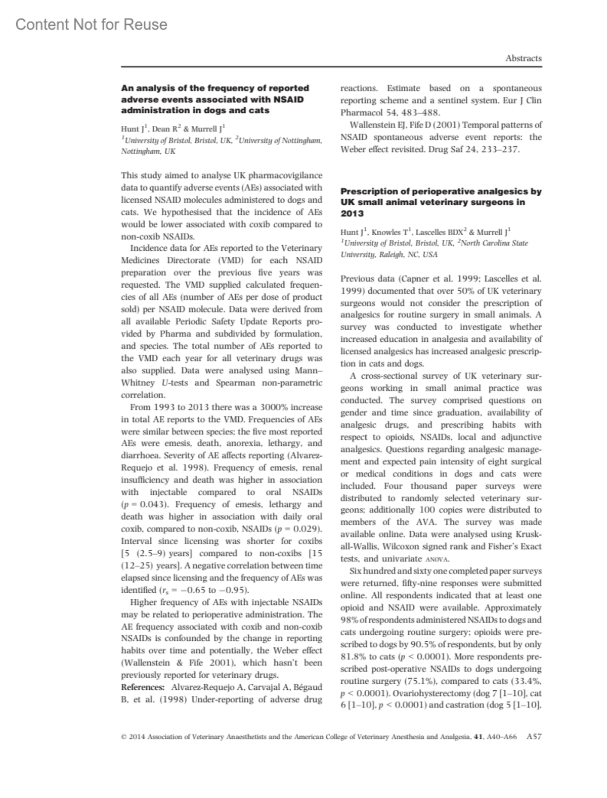 Prescription of perioperative analgesics by UK small animal veterinary surgeons in 2013Hunt, JKnowles, TLascelles, B DXMurrell, JAuthor information1University of Bristol, Bristol, UK, 2North Carolina State University, Raleigh, NC, USAVeterinary Anaesthesia and Analgesia 41(6):p A57-A58, November 2014.Copyright © 2014 John Wiley & Sons, Ltd