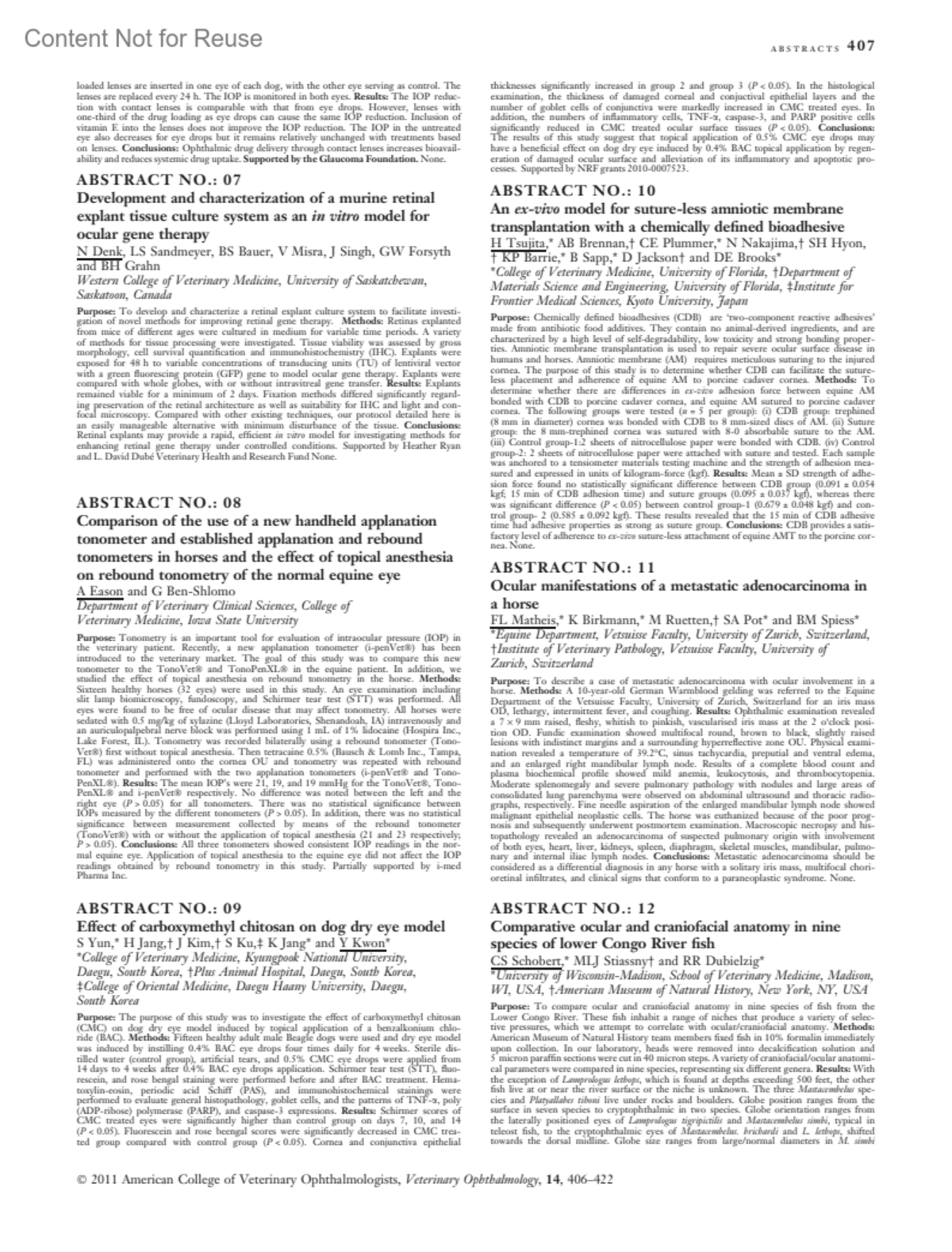 Ocular manifestations of a metastatic adenocarcinoma in a horseABSTRACT NO.: 11Matheis, F LBirkmann, KRuetten, MPot, S ASpiess, B MAuthor information*Equine Department, Vetsuisse Faculty, University of Zurich, Switzerland†Institute of Veterinary Pathology, Vetsuisse Faculty, University of Zurich, SwitzerlandVeterinary Ophthalmology 14(6):p 407, November 2011.Copyright © 2011 John Wiley & Sons, Inc.