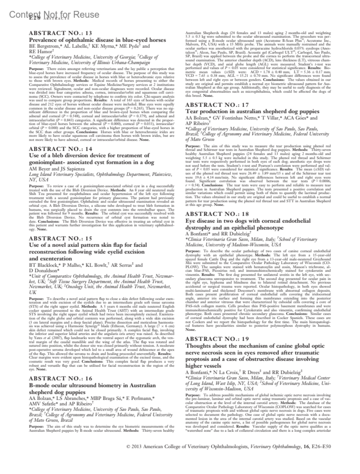 Prevalence of ophthalmic disease in blue-eyed horsesABSTRACT NO.: 13Bergstrom, B ELabelle, A LMyrna, K EPyde, M EHamor, R EAuthor information*College of Veterinary Medicine, University of Georgia; †College of Veterinary Medicine, University of Illinois Urbana-ChampaignVeterinary Ophthalmology 16(6):p E28, November 2013.Copyright © 2013 John Wiley & Sons, Inc.