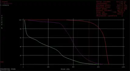 Dose volume histogram in case 1 (red: tumour, dark magenta: small intestine and surrounding tumour, and light green: right kidney).