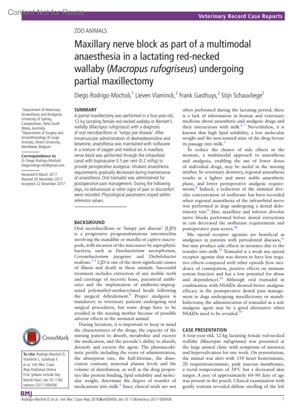 Maxillary nerve block as part of a multimodal anaesthesia in a lactating red‐necked wallaby (Macropus rufogriseus) undergoing partial maxillectomy