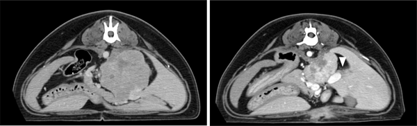 Radiographic and ultrasonographic examinations revealed a mass in the upper abdominal area. Ultrasonography showed that the tumour measured 76 × 51 × 52 mm and had invaded the CVC. The thoracic radiographs ruled out pulmonary metastasis. Following a CT scan (figure 3, left), the tumour was graded as T3N0M0 based on the WHO classification. The radiotherapy regimen included 26 Gy/four fractions/four weeks, and 95 per cent of the tumour received 6.5 Gy. The left kidney over 4 Gy was 31 per cent, and the intestine over 8 Gy was 1.5 ml in one fraction. The first three rounds of radiotherapy followed the same plan, while the fourth one was modified due to a reduction in tumour size. One month after the completion of radiotherapy, a gradual reduction in tumour size was noted. Eighteen months later, the tumour size was reduced to 55 × 37 × 40 mm (figure 3, right), and the tumour volume was down to 40 per cent of the initial volume. There were no radiation toxicities, including changes in renal size, and blood chemistry (before radiotherapy: ALT 28 iu/l, BUN 8.8 mg/dl and Crea 0.5 mg/dl, one month later: ALT 25 iu/l, BUN 15.6 mg/dl and Crea 0.7 mg/dl, two years later: ALT 28 iu/dl, BUN 22.8 mg/dl and Crea 0.6 mg/dl). No adverse events based on VRTOG and VCOG‐CTCAE were detected. However, masses were detected in the spleen, liver and lung after 14, 15 and 17 months, respectively. The spleen mass was resected by the referred veterinary hospital and was diagnosed as a metastatic lesion by haematoxylin and eosin stain histopathology. The dog developed paresis, and the survival time was 25 months after the last radiation therapy.
