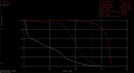 Dose volume histogram in case 1 (red: tumour, dark magenta: small intestine and surrounding tumour, and light green: right kidney).