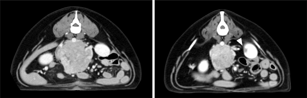 A seven‐year‐old male bulldog weighing 23.4 kg was presented to the referring veterinarian for vomiting for the past two weeks. Radiographic and ultrasonographic examinations revealed a mass in the upper abdominal area. The patient was referred to the Veterinary Teaching Hospital, Azabu University, for further evaluation.