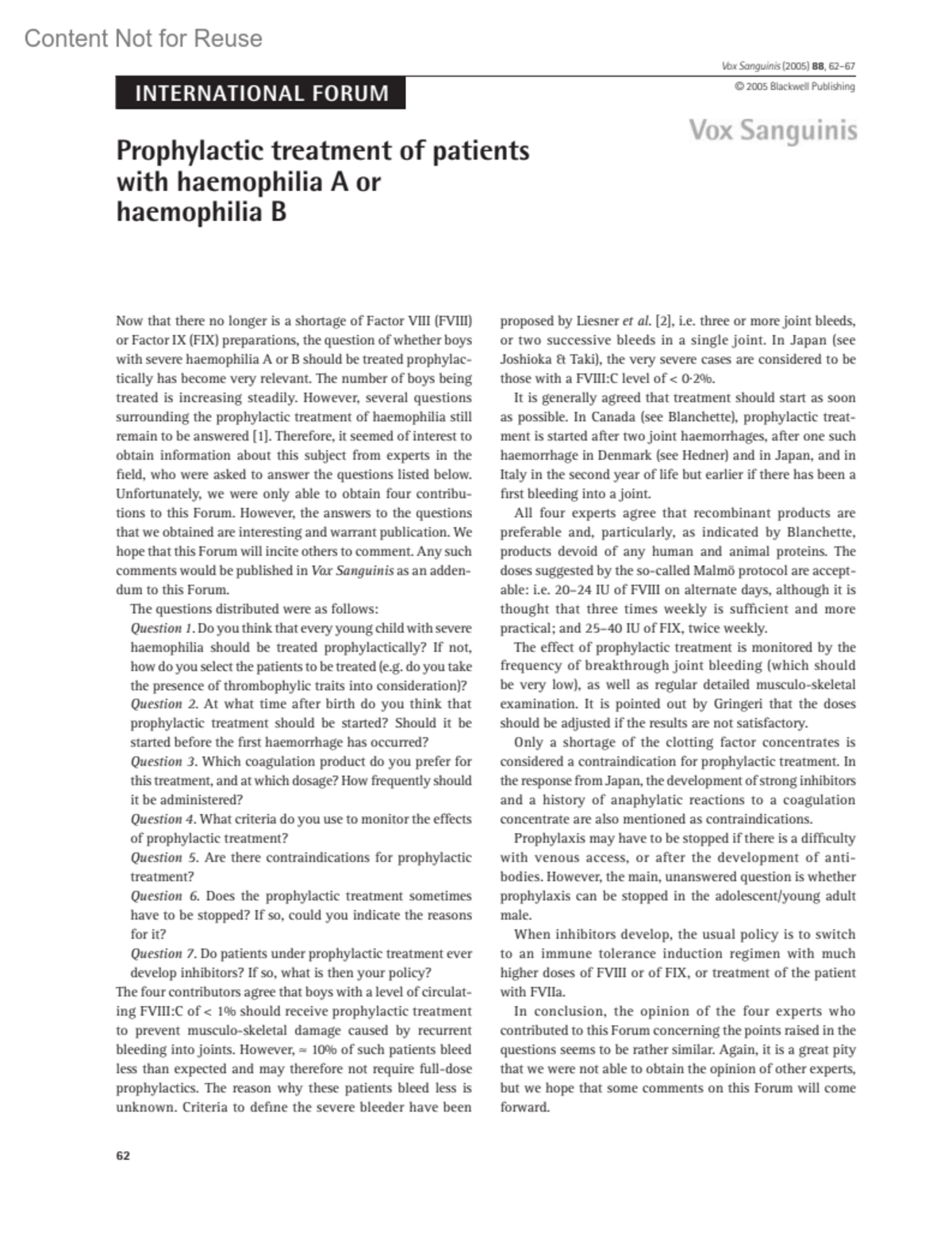 Prophylactic treatment of patients with haemophilia A or haemophilia BYoshioka, A.Taki, M.Author informationDepartment of Pediatrics, Nara Medical University, 840 Shijo-cho, Kashihara, Nara, Japan 634-8522 (Yoshioka)Department of Pediatrics, St Marianna University School of Medicine, 2-16-1 Sugao, Miyamae-ku, Kawasaki, Kanagawa, Japan 216-8511(Taki)E-mail: [email protected]E-mail: [email protected]Vox Sanguinis 88(1):p 65-66, January 2005.Copyright © 2005 Blackwell Publishing Ltd.