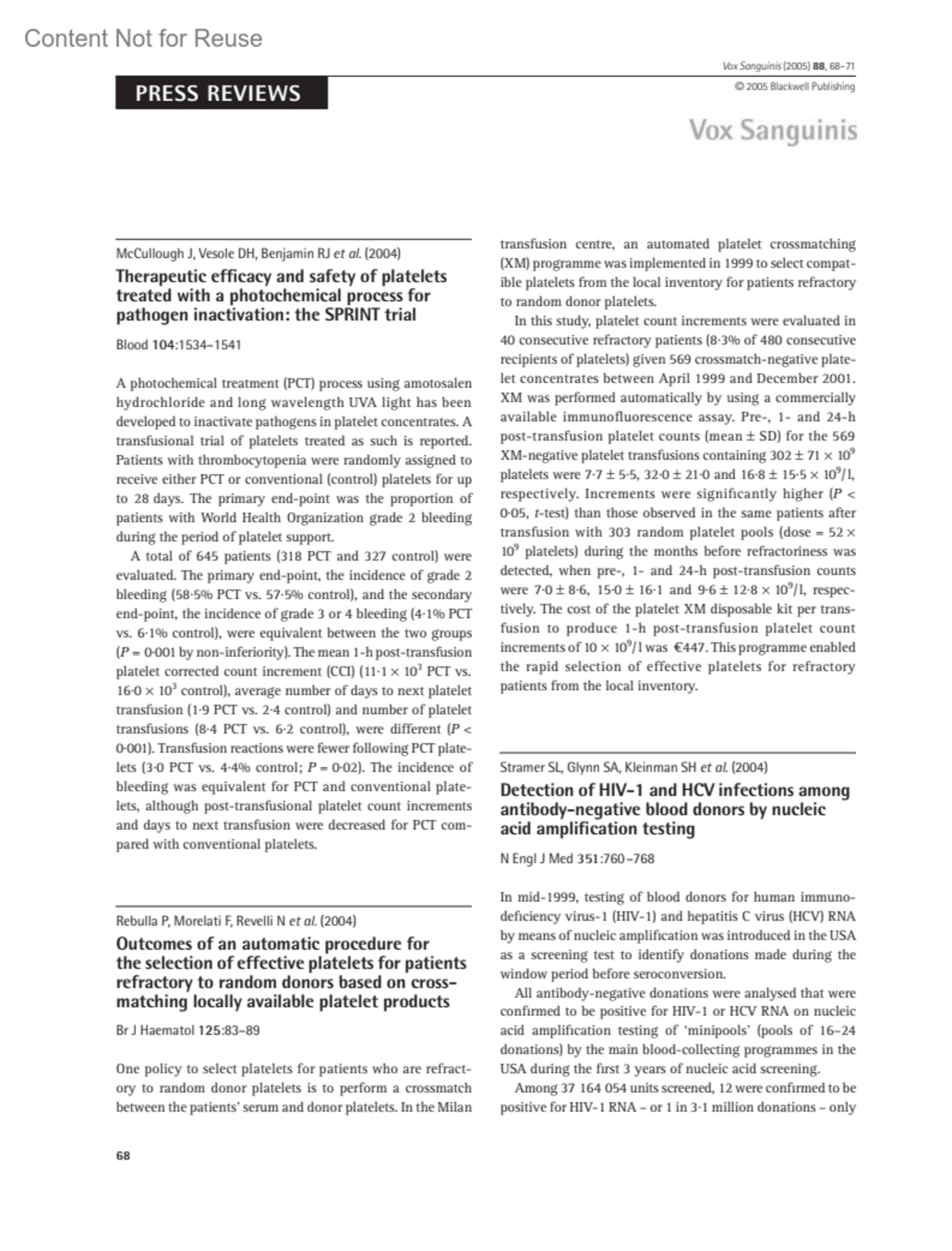 Detection of bacterial contamination of platelet componentssix years' experience with the BacT/ALERT systemMunksgaard, LAlbjerg, LLillevang, S TVox Sanguinis 88(1):p 69, January 2005.Copyright © 2005 Blackwell Publishing Ltd.