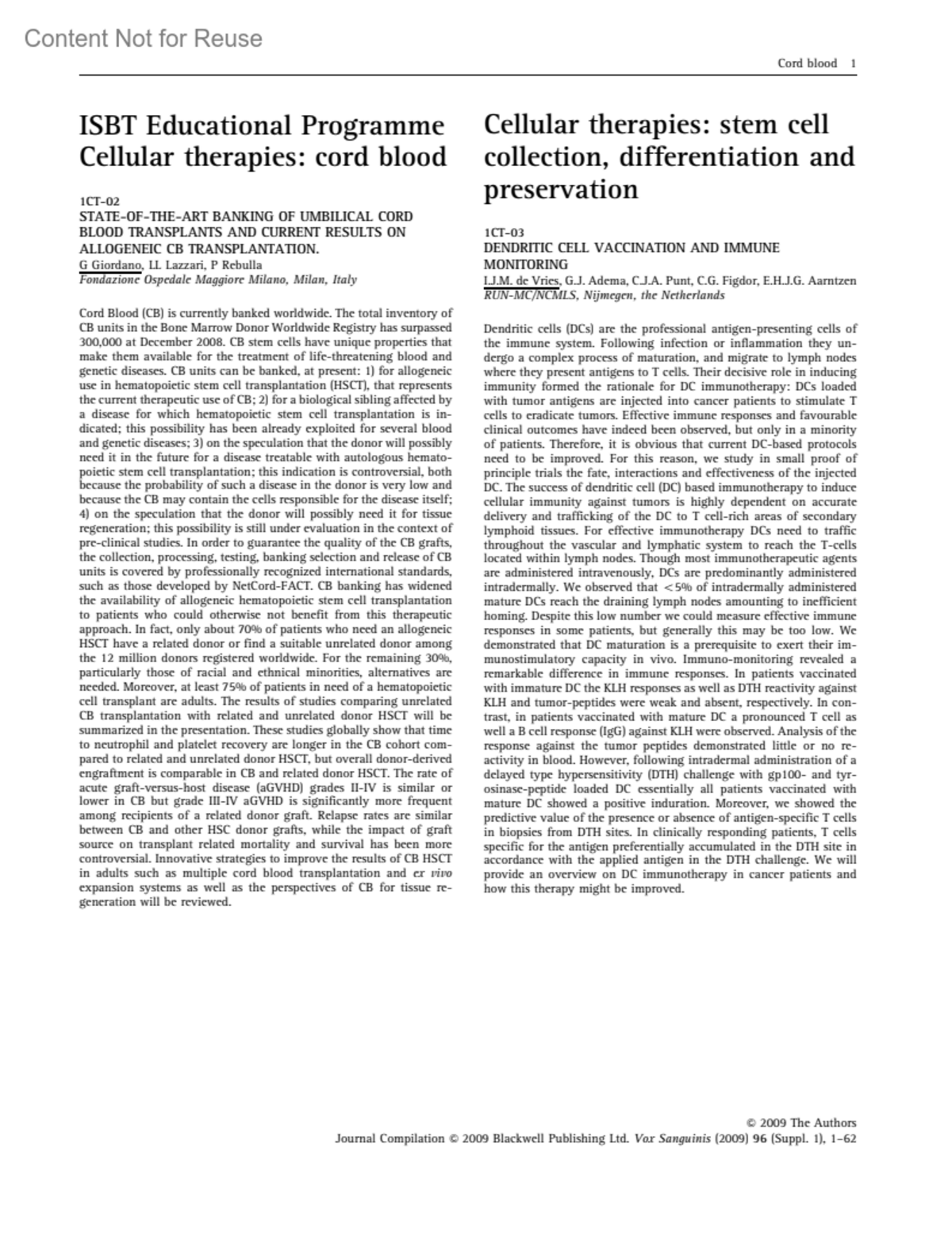 STATE-OF-THE-ART BANKING OF UMBILICAL CORD BLOOD TRANSPLANTS AND CURRENT RESULTS ON ALLOGENEIC CB TRANSPLANTATION.1CT-02Giordano, GLazzari, L LRebulla, PAuthor informationFondazione Ospedale Maggiore Milano, Milan, ItalyVox Sanguinis 96:p 1, April 2009.Copyright © 2009 Blackwell Publishing Ltd.