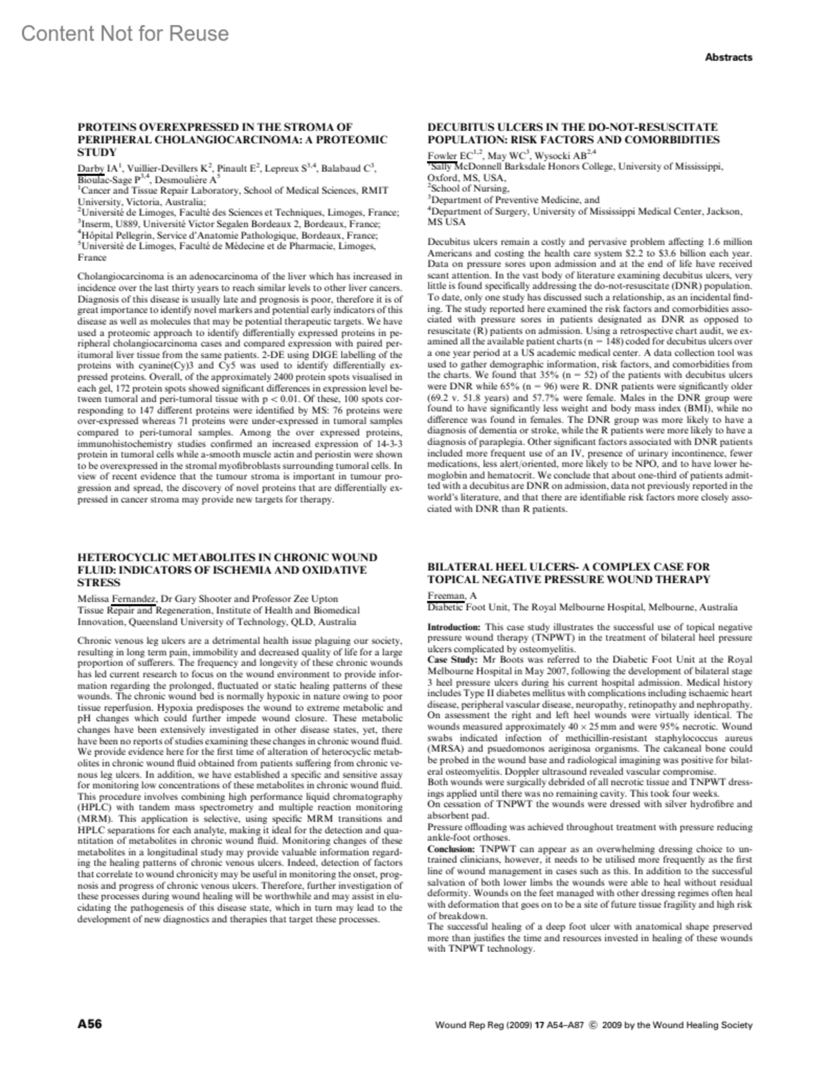 BILATERAL HEEL ULCERS- A COMPLEX CASE FOR TOPICAL NEGATIVE PRESSURE WOUND THERAPYFreeman, AAuthor informationDiabetic Foot Unit, The Royal Melbourne Hospital, Melbourne, AustraliaWound Repair and Regeneration 17(4):p A56, July-August 2009.Copyright © 2009 Blackwell Publishing Ltd.