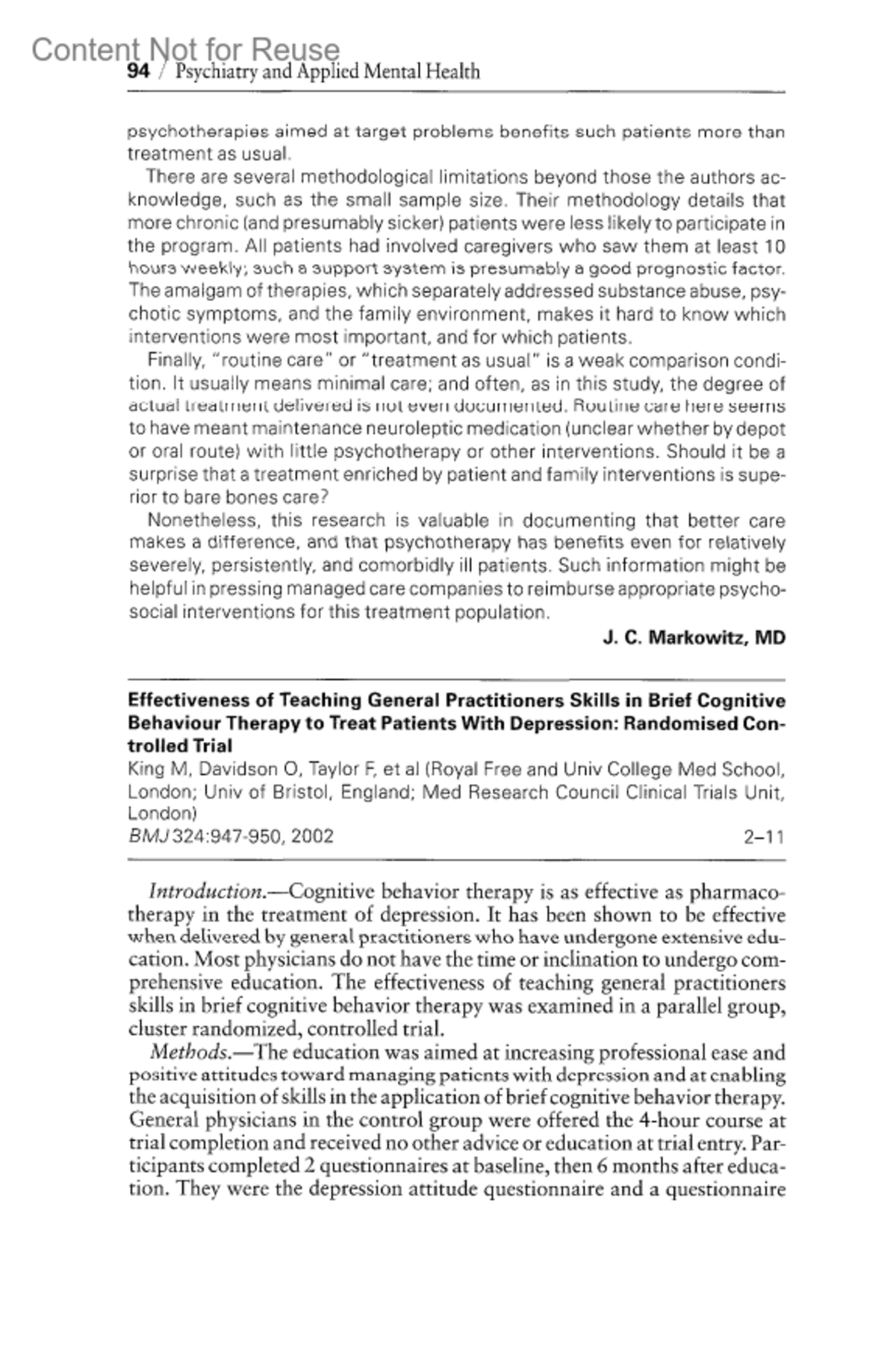 Effectiveness of Teaching General Practitioners Skills in Brief Cognitive Behaviour Therapy to Treat Patients With Depression: Randomised Controlled Trial