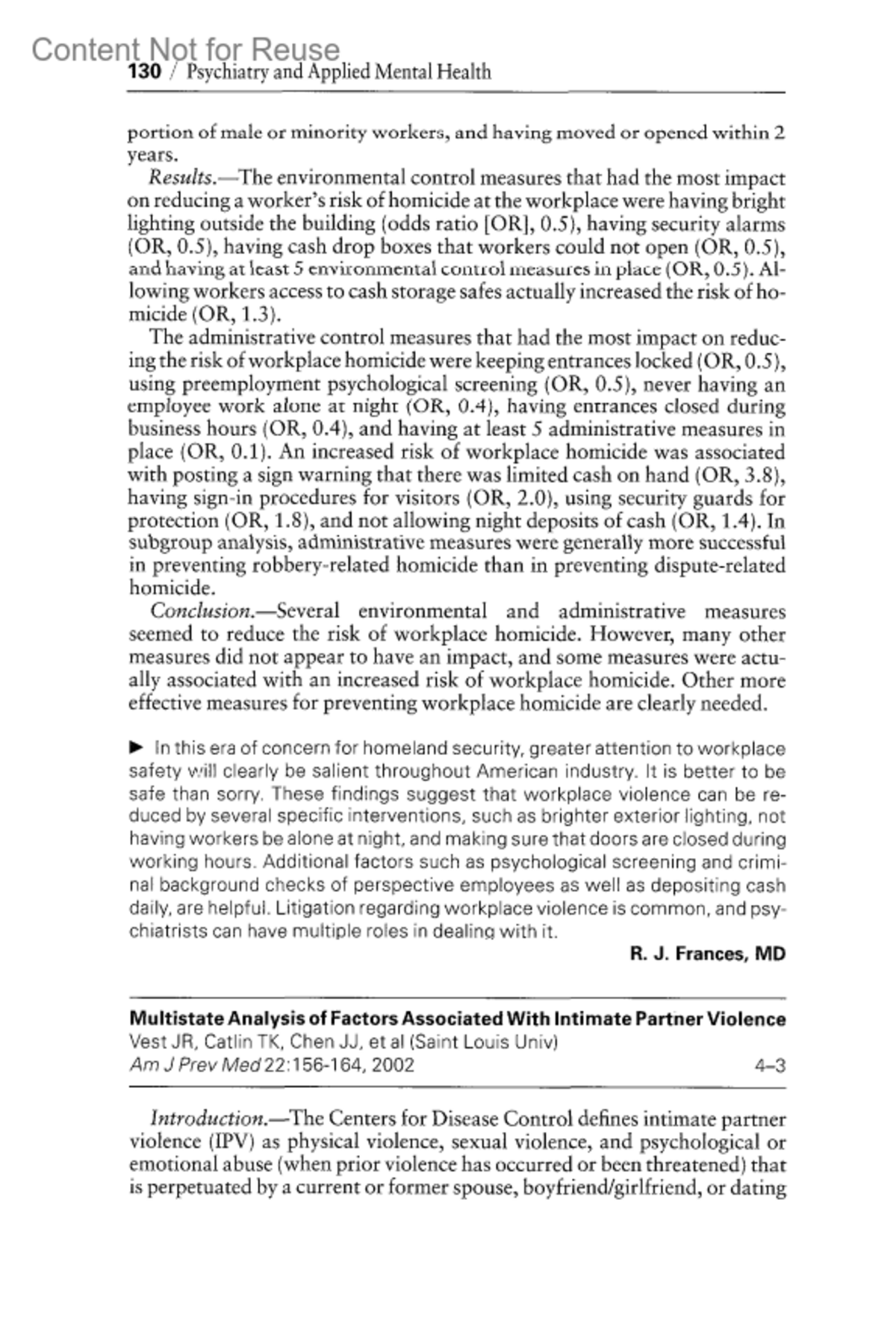 Multistate Analysis of Factors Associated With Intimate Partner ViolenceVest, J RCatlin, T KChen, J Jet al, Author informationClinical Professor, New York University Medical School; President and Medical Director, Silver Hill Hospital, New Canaan, ConnecticutSaint Louis UnivYear Book of Psychiatry & Applied Mental Health 2003(1):p 130-131, 2003.Copyright © 2003Elsevier, Inc.