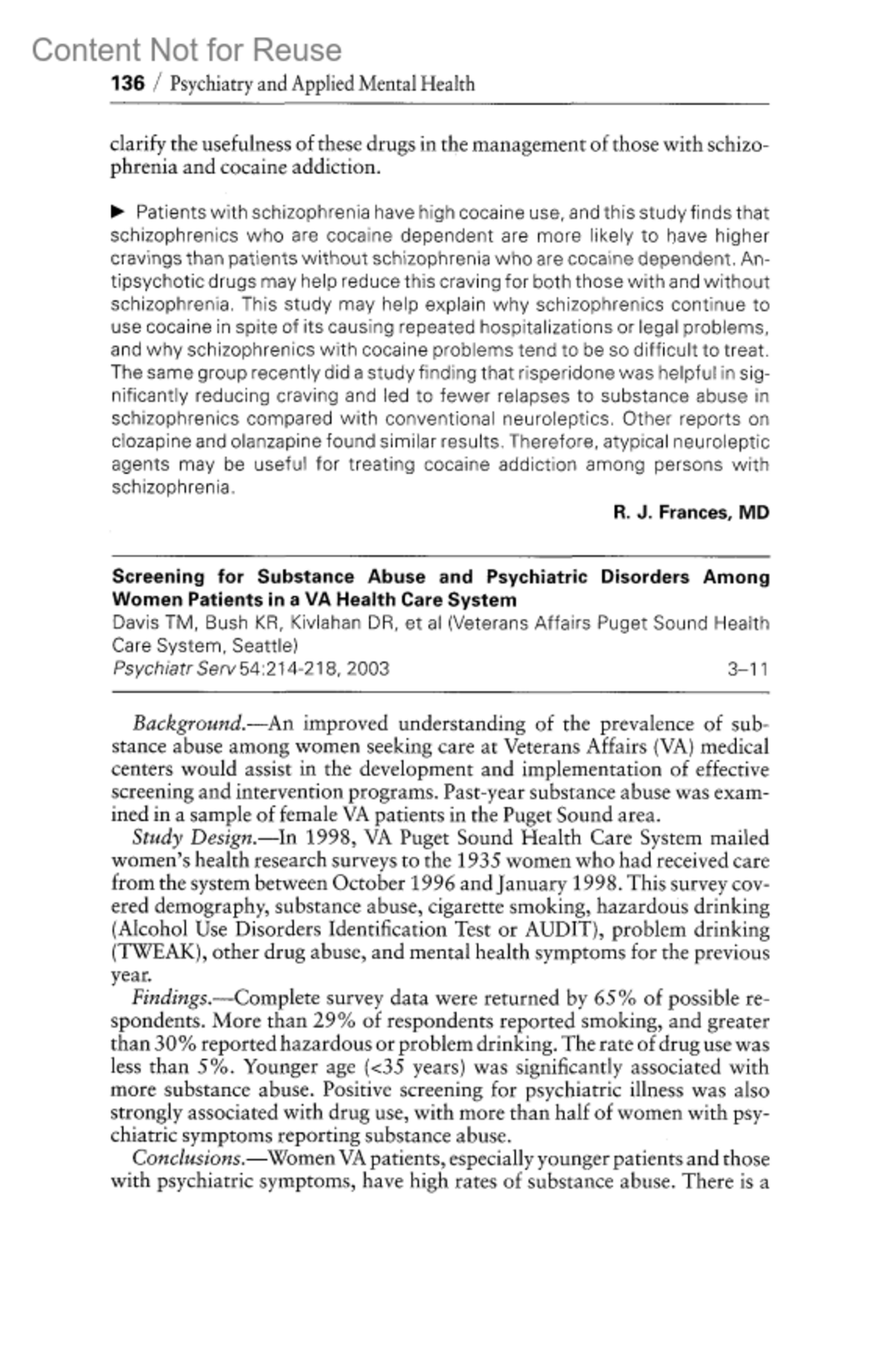 Screening for Substance Abuse and Psychiatric Disorders Among Women Patients in a VA Health Care System
