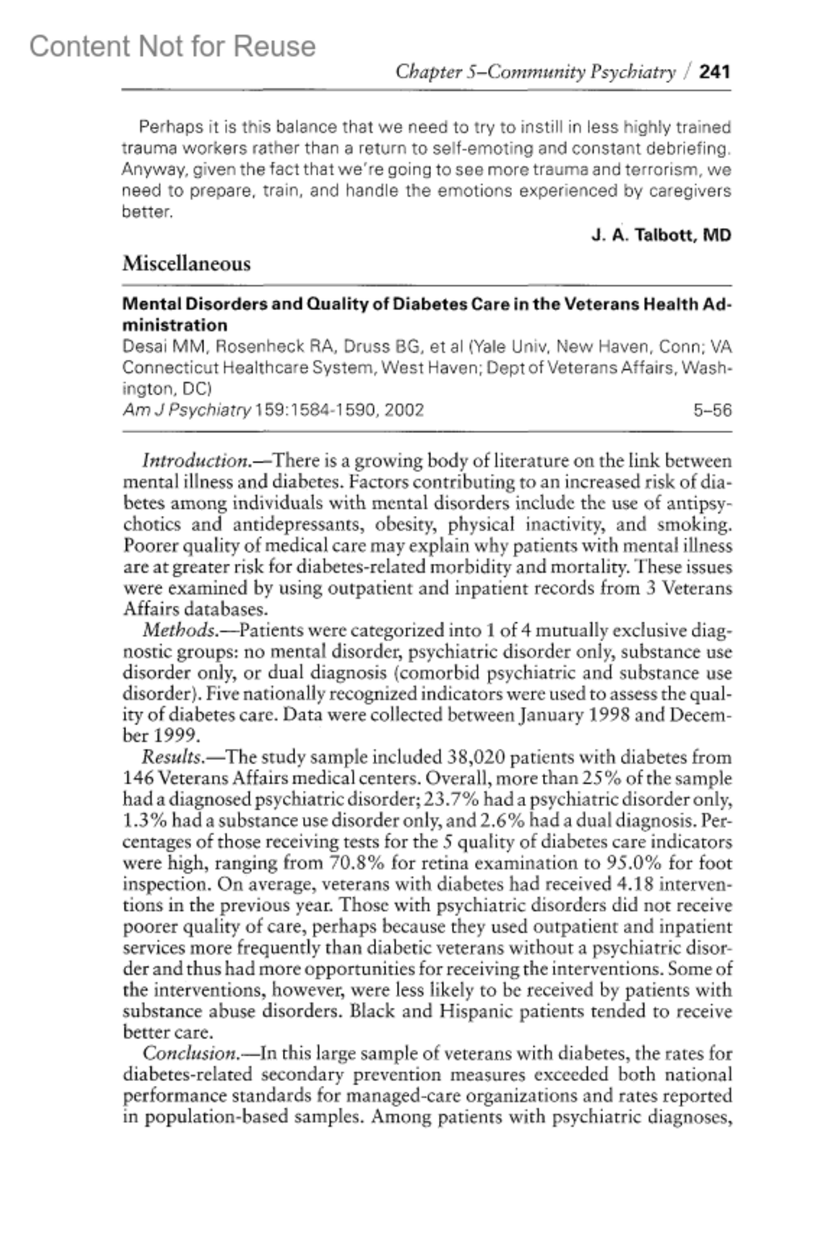 Mental Disorders and Quality of Diabetes Care in the Veterans Health AdministrationDesai, M MRosenheck, R ADruss, B Get al, Author informationProfessor, Department of Psychiatry, University of Maryland School of Medicine, Baltimore, MarylandYale Univ, New Haven, Conn; VA Connecticut Healthcare System, West Haven; Dept of Veterans Affairs, Washington, DCYear Book of Psychiatry & Applied Mental Health 2004(1):p 241-242, 2004.Copyright © 2004Elsevier, Inc.