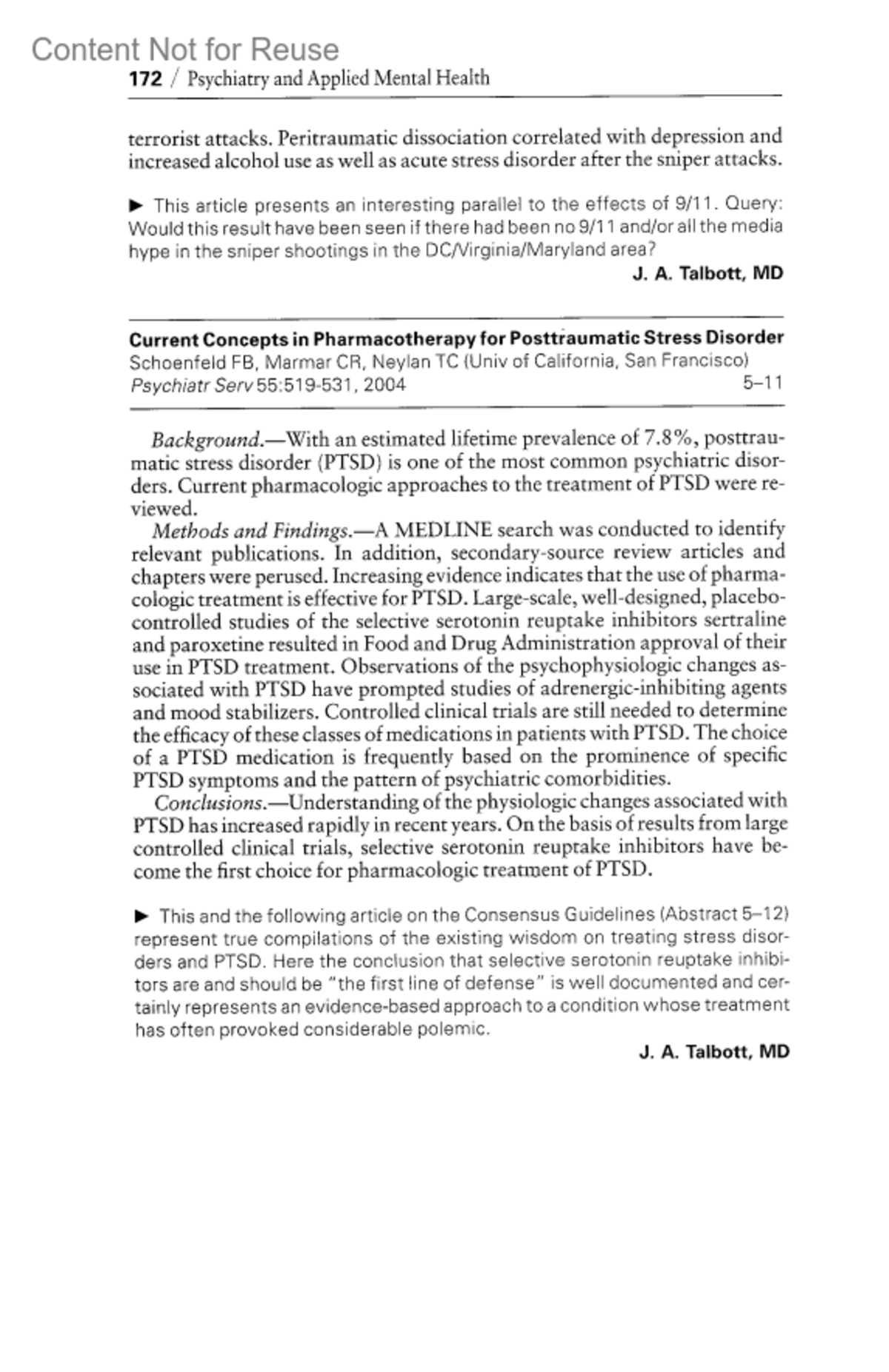 Current Concepts in Pharmacotherapy for Posttraumatic Stress DisorderSchoenfeld, F BMarmar, C RNeylan, T CAuthor informationProfessor, Department of Psychiatry, University of Maryland School of Medicine, Baltimore, MarylandUniv of California, San FranciscoYear Book of Psychiatry & Applied Mental Health 2005:p 172, 2005.Copyright © Mosby-Year Book Inc. 2005. All Rights Reserved.