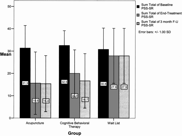 —Posttraumatic Stress Symptom Score (PSS-SR), Group X Time, Intent to Treat. (Reprinted from Hollifield M, Sinclair-Lian N, Warner TD, et al. Acupuncture for posttraumatic stress disorder: a randomized controlled pilot trial. J Nerv Ment Dis. 2007;195:504-513, with permission from Lippincott Williams & Wilkins.)
