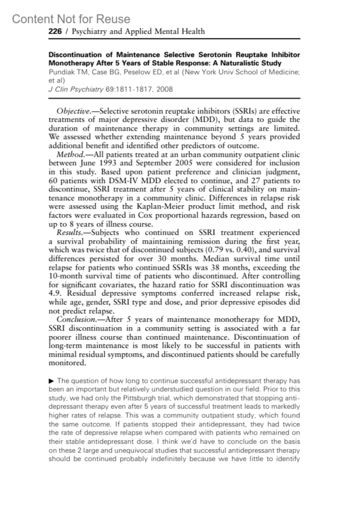 Discontinuation of Maintenance Selective Serotonin Reuptake Inhibitor Monotherapy After 5 Years of Stable Response: A Naturalistic Study